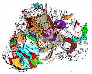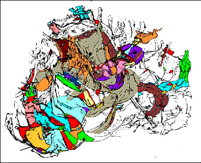 以下的这张图是在法国的庇里牛斯山区的三兄弟洞窟(cave of Les Trois Freres)发现的石板画[2]。画中有许多的马匹以及其他的动物,层层重叠在一起,有的还倒过来画,非常难以分辨究竟画了什么?经过专家仔细地分析,发现在许许多多的动物之中,有一个骑士的画像。他袖子卷起来,穿着一件背心,一条宽腰带,一双长统靴,一把短剑插入位于左靴处的剑鞘,这个骑士左手伸入裤子左边的口袋中。他的长发看起来在风中飘扬,其实也恰好是一只动物的形象。旧石器时代晚期的原始人怎么会画出这么复杂的图案?他们怎么会穿靴子呢?