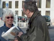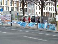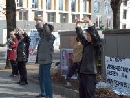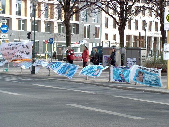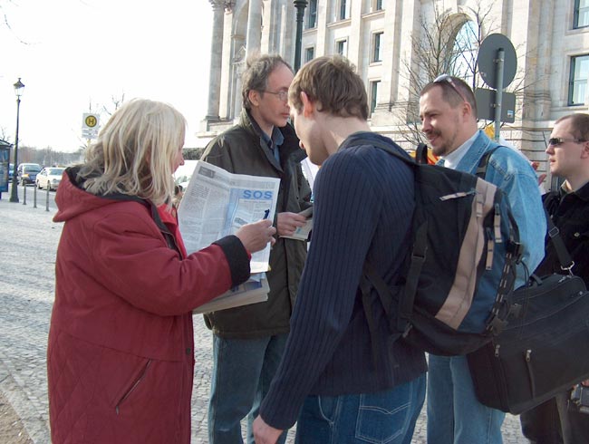 当日气候恶劣,狂风大作,学员们不为所动,坚持展示祥和的音乐和五套功法。展示的横幅无数次被狂风刮走,甚至撕裂,学员们无数次地粘补、修复,再挂上。狂风中,学员们频频发正念,每次发完正念后风就停了。中西学员们不断地向路人讲述江氏疯狂迫害善良的法轮功修炼者的事实真相,发动愿意签字的德国民众接力在熟人中征签,之后马上邮给议会主席、外长及联邦总统。柏林有很多俄国游人,俄裔大法弟子就用家乡话讲真相。