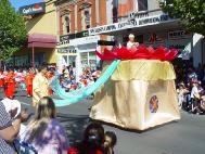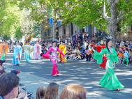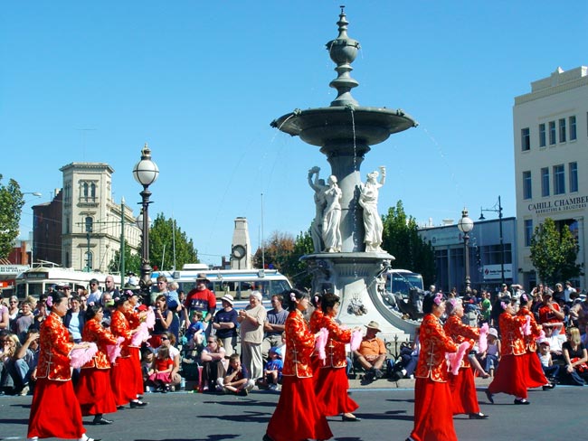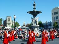 | 游行队伍经过市中心 | 唐装表演 | 红绸舞 |