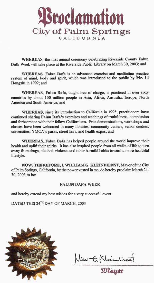鉴此,我,威廉.G.克雷因迪恩斯特(William G. Kleindienst),加利福尼亚州棕榈泉(Palm Spring)市市长,根据赋予我的权力,特此宣布2003年3月24日至30日为: