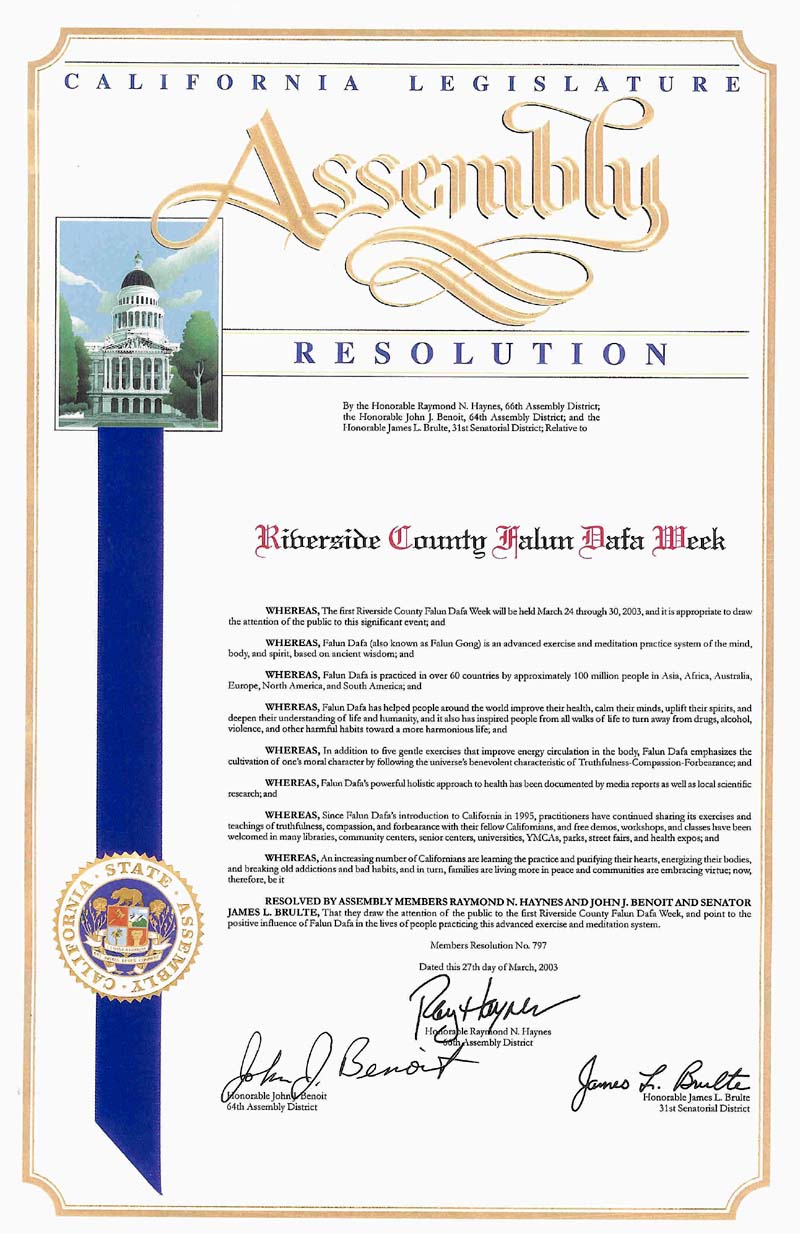 鉴于,自1995年法轮大法在加州传出后,学员们一直不间断地向加州民众分享该功法和真、善、忍的法理。免费的功法示范、介绍班和教功班在图书馆、社区活动中心、老年活动中心、大学、YMCA、公园、集市和健康博览会等众多地方都受到欢迎;并且