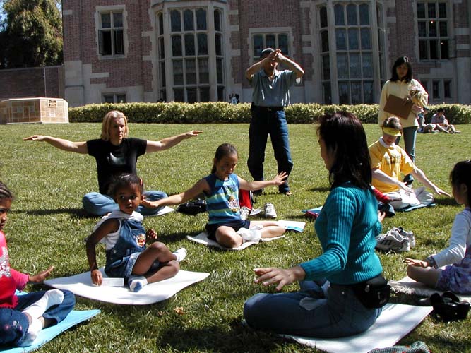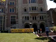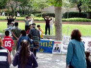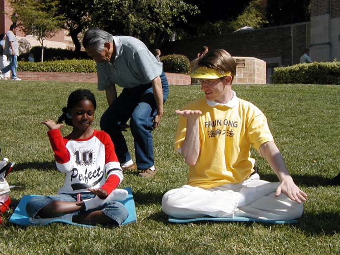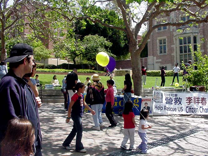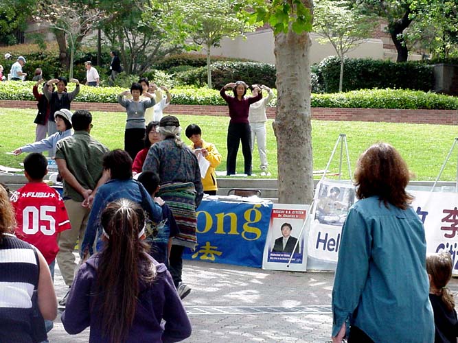 行人们被优美的功法吸引,驻足学功的人络绎不绝,特别是年幼的孩子们,更是纷纷取走免费书签和真相光盘,并当场学功。