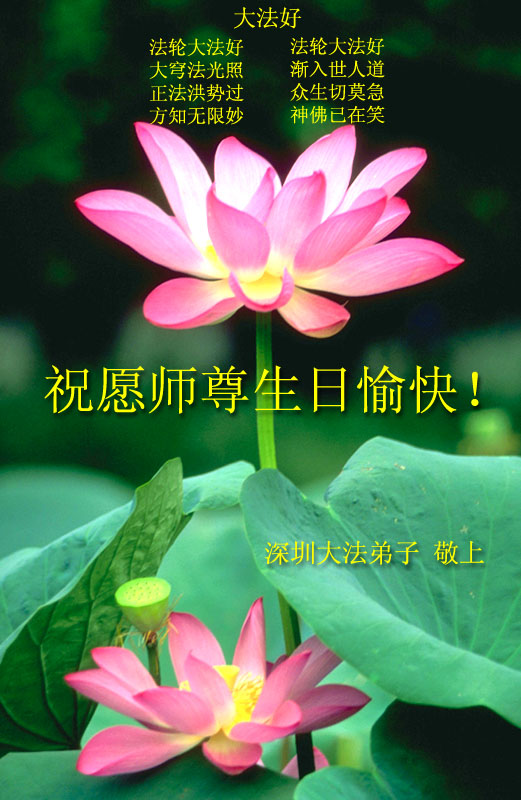 祝师父生日快乐!千言万语,难颂师恩!不管处面环境如何,弟子们一定坚修大法紧随师,学好法,多讲真象发正念,完成正法时期大法弟子的神圣使命!