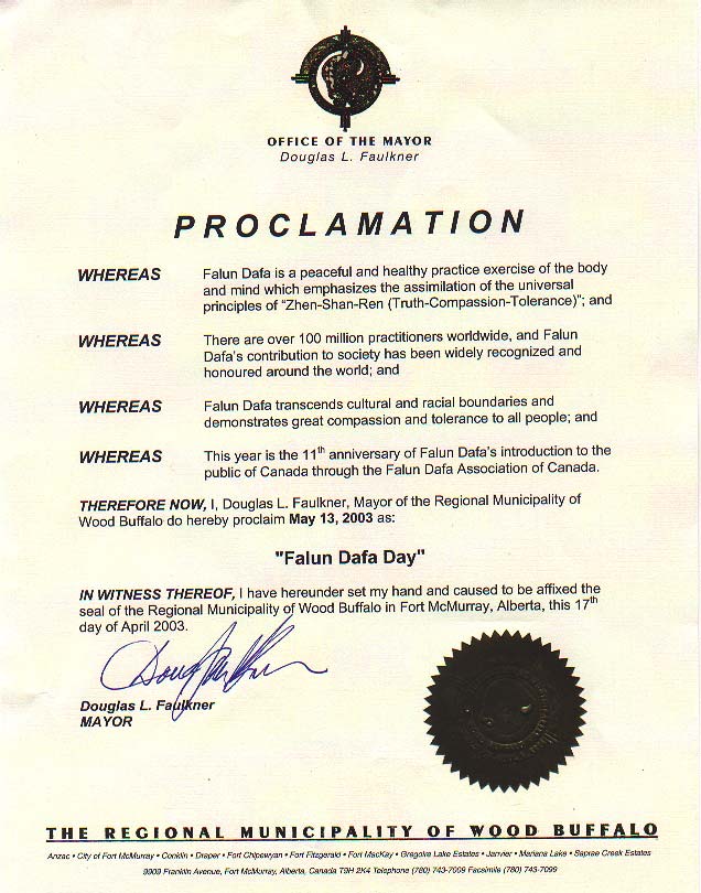 鉴此,我,伍德布法罗自治区区长道格拉斯 L 弗奥克勒,在此郑重宣布2003年5月13日为: