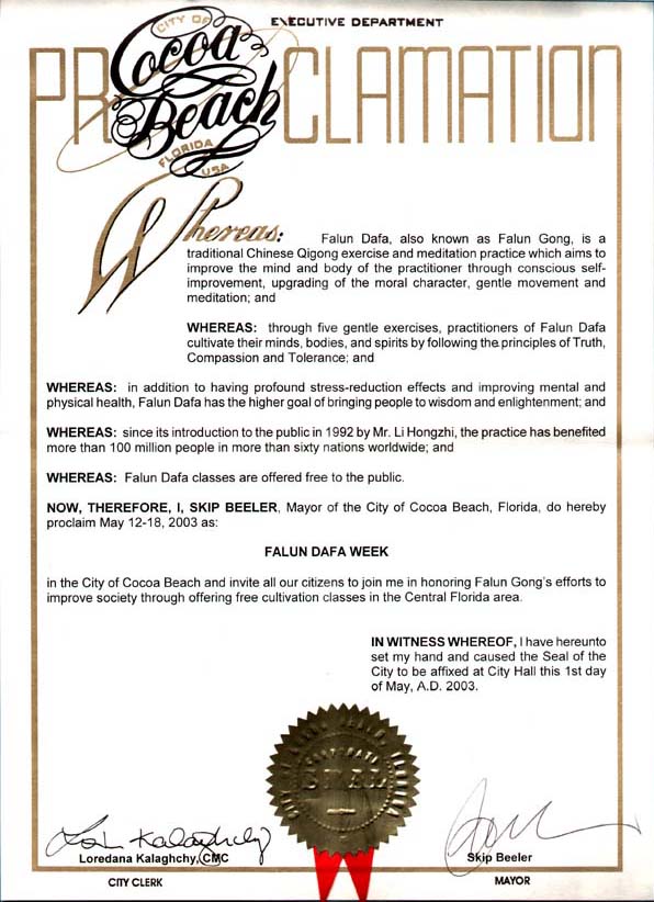 并邀请我们的全体市民与我一道赞扬法轮功学员通过在佛罗里达中部地区提供免费修炼课程,促进社会的努力。
