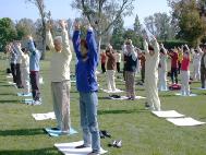 洛杉矶大法弟子集体炼功庆祝世界法轮大法日伟大的师尊穷尽人类的智慧也难以想象得到:一切宇宙生命本源的创造者;但是我可以感受他的智慧──法轮大法。