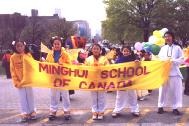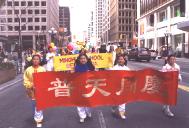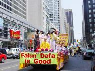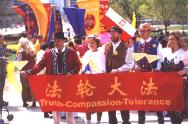 随后,是支持法轮功的民众队伍,举着各色“真善忍”小旗,他们中有支持法轮功的,有刚刚开始学功的,特别值得一提的是,有两个年轻的大学生,看到我们要游行,非常开心,欣然加入我们的游行队伍,跟我们一起走了很久,最后依依不舍的和我们挥手告别。他们说,他们是在这儿长大的华人子弟,看到有这么多的华人游行非常高兴,所以来支持一下。
