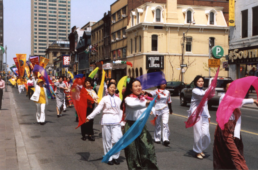 在彩车的后面是身着世界各民族服装的弟子们和挥舞彩带的舞蹈队,代表了法轮大法洪传世界各国。随后是身着黄色大法服装的弟子们的方阵。