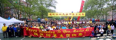 大纽约地区法轮功学员昨(11)日在曼哈坦华埠举行庆祝法轮大法弘传11周年,500多名学员参与游行。学员表示母亲节当天庆祝,除了深具感恩意义,也希望许多因修行法轮功受到迫害而流离失所的家庭,能够早日团聚。