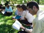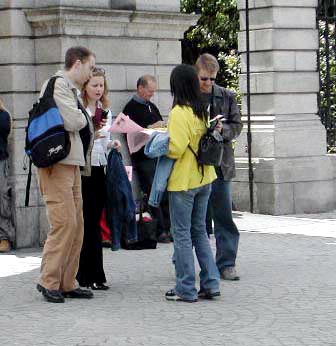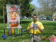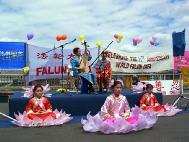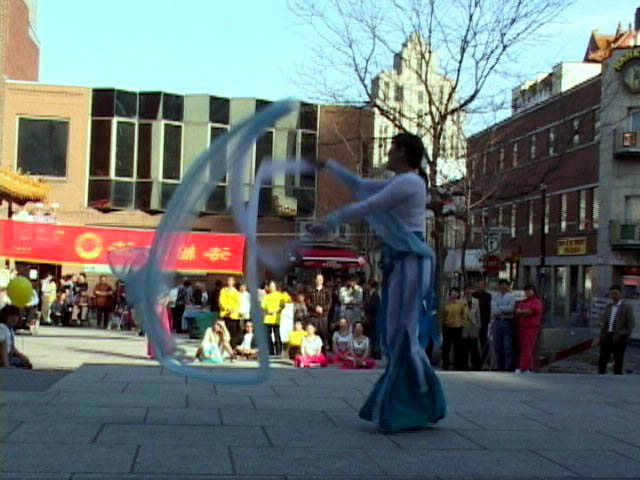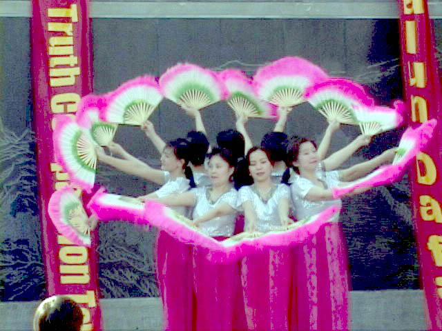 “法轮大法好 渐入世人道”──美国首府华盛顿特区庆祝世界法轮大法日活动纪实。五月十日上午,大法弟子在首府华盛顿DC国家广场举行“2003年世界法轮大法日”的庆祝活动。熙熙攘攘的游人驻足观看大法弟子们的表演的歌曲、舞蹈、诗朗诵等艺术节目、功法演示,人们仔细看着“正法之路”图片展,阅读着大法弟子们递上的真象资料。大法弟子与世人形成了一片祥和融洽浑然一体的场面。
