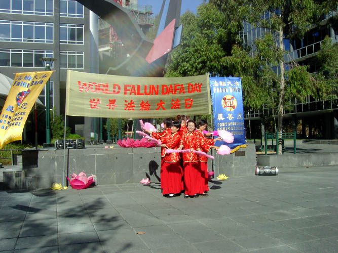 5月10号,星期六,一个阳光明媚的日子,澳大利亚墨尔本法轮大法周在位于市中心的亚若河畔拉开了序幕,学员们身穿鲜艳的中国传统服装,以歌曲、舞蹈、功法演示、图片展览等多种形式来庆祝法轮大法洪传十一周年及世界法轮大法日,人们又从另一个视角看到了法轮大法的美好,有一位老先生从河对岸跑来对我们说:你们真是太美了!