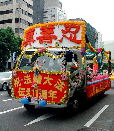 大法弟子的队伍浩浩荡荡,领头一群身着古装的仙女,她们手持花篮、彩带,满面春风,翩然起舞。随后是鲜艳花朵盛装的大型彩车,车头上的“真善忍”金黄大字分外醒目。车上身着金黄色炼功服的弟子们,伴随着音乐演示着法轮功5套功法。4位女弟子手持一面法轮图形随后,世界法轮大法日的横幅跟随,其后是一人划桨,引领一只旱船,荡漾前行,4位弟子少女打扮,肩挑花篮而来,再后便是欢快活泼且颇具中国东北地方特色的“大秧歌”方阵。身穿鲜艳唐装的大法弟子们,在锣鼓喧天的秧歌曲中起舞,最后是举着各式庆祝横幅的男女老幼弟子,个个脸上流光溢采,游行队伍一路走来,让人目不暇接,美不胜收。