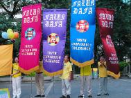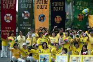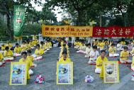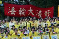 傍晚时份,约二百名学员来到遮打花园集体炼功,在六点钟他们集体发正念的时间刚过去,苍穹中突然出现奇特光景,既有七色的大光环,也有壮观的云彩变化,把他们都吸引住了。庆祝活动在一片“法轮大法好”的欢快歌声中结束。