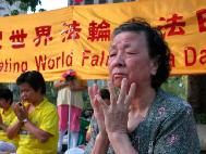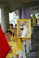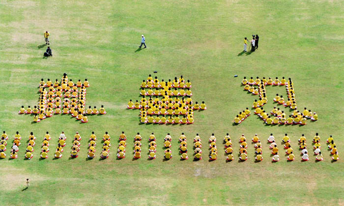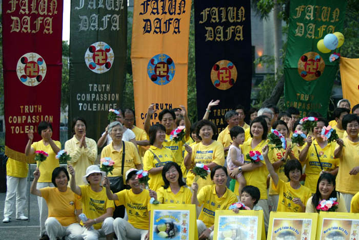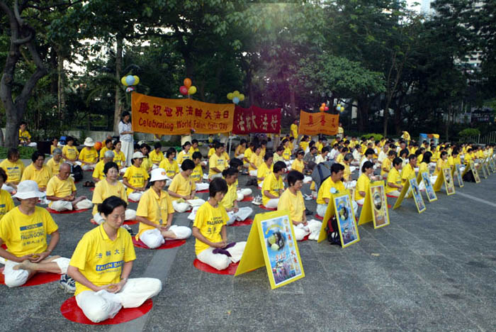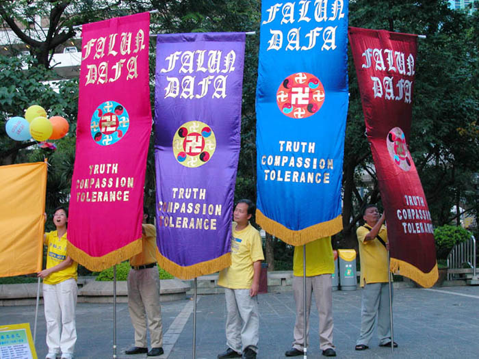 经历了萨斯瘟疫的香港,在5月13日阳光特别明媚。身穿黄衣服的法轮功学员祥和而整齐的炼功动作,吸引了不少人驻足欣赏。