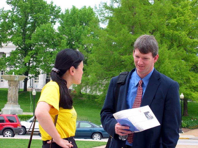 一次去外面小吃店吃饭,看到年轻的店主夫妇带着一个两三岁的孩子,生活得真难,便想给他们讲真相。以前每次面对面讲真相,我都心里不稳,总担心别人不理解,怕人家说自己,虽然也努力排除这种干扰,可总是突破不了。而那天,当我对他们讲真相,并告诉他们:“请记住‘法轮大法好’、‘真善忍好’”的时候,心里没有一丝一毫的怀疑,我第一次感到周围笼罩在一片祥和的场中,而且我发自内心的相信师父就在我的身边,我眼睛有点潮湿。而这过程中女主人两次掉了眼泪,并不停的对我说:“谢谢你!太谢谢你了!今天能够碰到你,我真是太幸运了。”当时她的孩子就在我旁边,我又对孩子说:“记住‘法轮大法好’、‘真善忍好’。”年轻的母亲听了我的话,马上拉着孩子:“快,快跟阿姨说呀。”那焦急的神情,仿佛生怕孩子不听我的话似的。后来我离开的时候,她问我能不能让她看看大法的书。第二天我便送书给她。她几天就看完了《转法轮》,并学会了五套功法,后来她不止一次的对我说:“这个法太好了,我得学下去!不管多难我都得学下去!”现在她每天都学法、炼功。而那时,我刚刚背完第一讲。