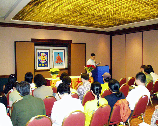 法会在一片庄严,祥和的气氛中开始。学员们在发言中坦诚相见,对自己在修炼中存在的不足做了深刻的剖析,每一位在场的学员都深受感动,大家沐浴在一片祥和慈悲的气氛中。几位没有准备发言稿的学员也纷纷上台畅所欲言。值得一提的是,这次法会,学员在交流中冲破了旧有的观念,提到了很多在修炼中自己一直存在的误区或长久以来一直干扰自己的不好的思想。每个学员都感觉受益颇多。法会快要结束时,大家还意犹未尽,都不愿离开。