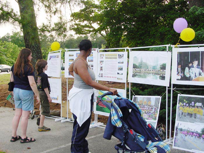 5月10日这天,天气晴朗,蓝蓝的天空飘着朵朵白云,亚特兰大几十名学员于中午时分来到了亚城著名风景点——石头山(Stone Mountain),摆好大法洪传世界和揭露邪恶迫害的真相展板,向众多的游客洪法、讲真相。明媚的阳光下,熠熠生辉的“世界法轮大法日”牌子、学员们的黄衣服以及精心布置的展板构成了石头山一道亮丽的风景线。游客不间断地被吸引到展板的前方,他们仔细地观看着图片,对这场镇压深感愤怒和困惑,询问很多的问题。学员们也就充份利用这个机会深入浅出地讲解着真相,从而使得这些有缘的游客对大法有了很正面的了解。在展板的一侧,伴随着炼功音乐,学员们向世人展示着优美、祥和的功法。看着这一切,人们不由得欣赏起大法的美好、纯善和祥和。
