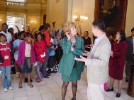 庆祝会期间,有一群中学生们参观州政府,正好看到了功法表演和文艺表演。他们被大法的美好和中国传统文化的博大精深深深地吸引住了,没有座位,索性坐在地上观看,直到结束,才恋恋不舍地离开。
