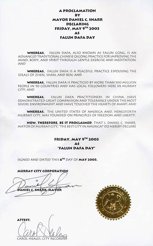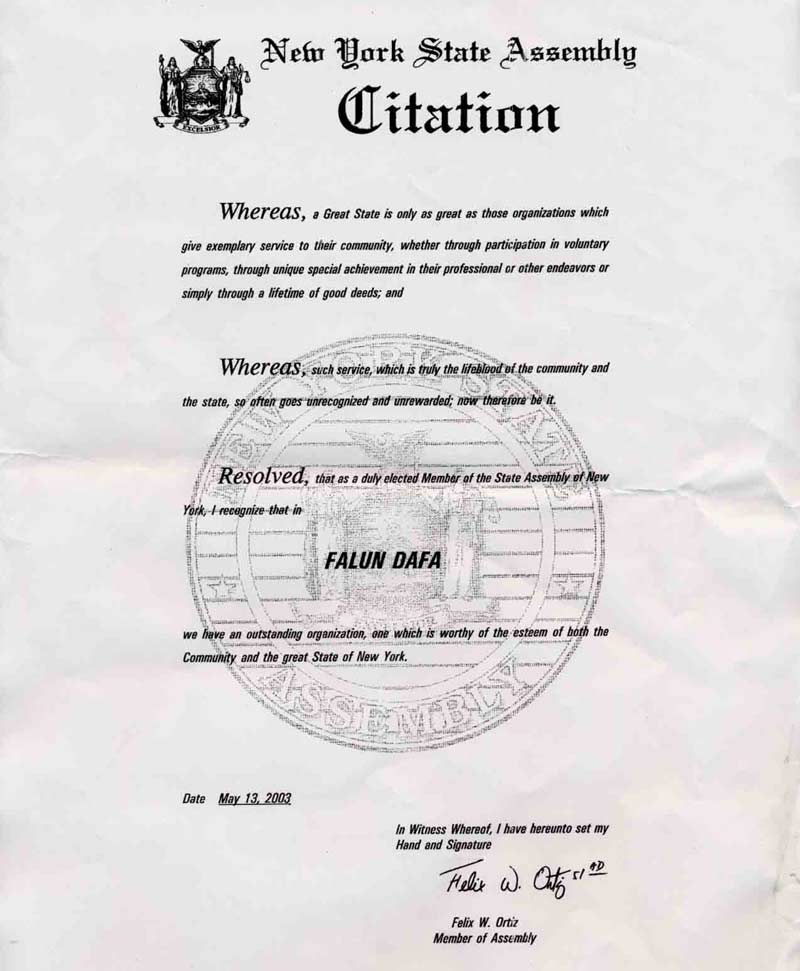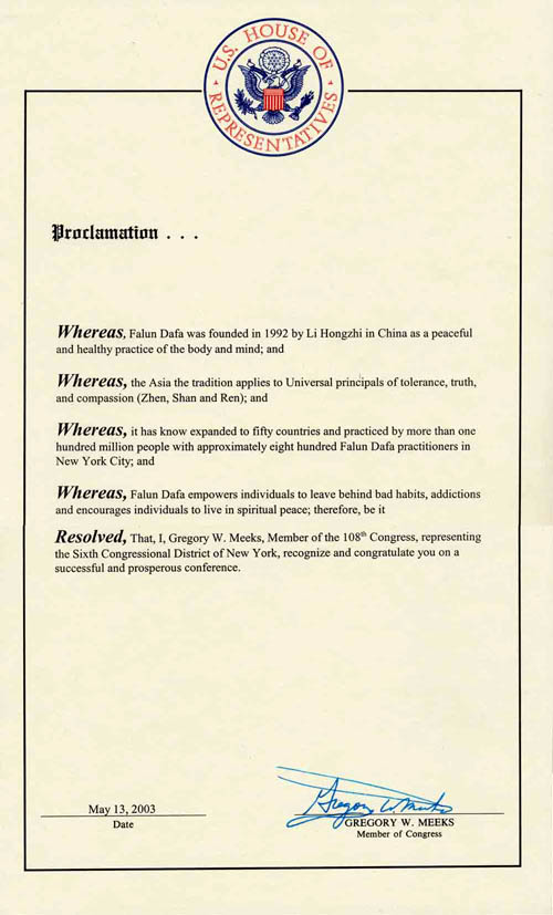 马萨诸塞州众议院褒奖李洪志先生和法轮大法
