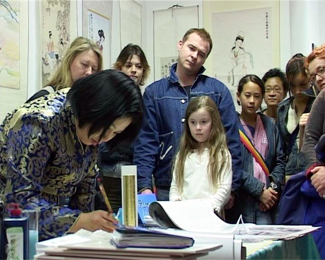 章翠英女士在展览会上对观众说,她曾因严重的关节炎一度失去作画的能力,是法轮功使她恢复了健康,得以重新施展艺术才华。当江××集团镇压法轮功以后,章女士回国上访,却因此而被关押折磨了8个月之久,在澳大利亚政府的大力营救下才重获自由。章女士希望与会人士能够伸出援手,维护真善忍的信仰,支持法轮功学员争取自由的努力。