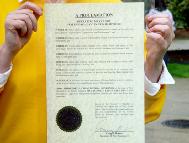 【明慧网2003年5月17日】法轮功学员在新罕布什尔庆祝法轮大法日时,访问了州首府康克德。州长克雷格-本森(Craig Benson)宣布2003年5月13日为新罕布什尔的法轮大法日。法轮功学员拜访了州长办公室,赠送了他艺术家法轮功学员的一幅画。法轮功学员还将艺术作品赠送给了参议员安德-马太尔(Andre Martel)以及起草法轮大法日褒奖的州长助理。正在参观州议院的学生们和他们的老师也接受了法轮大法的书签。这是一次非常愉快的活动。