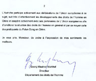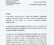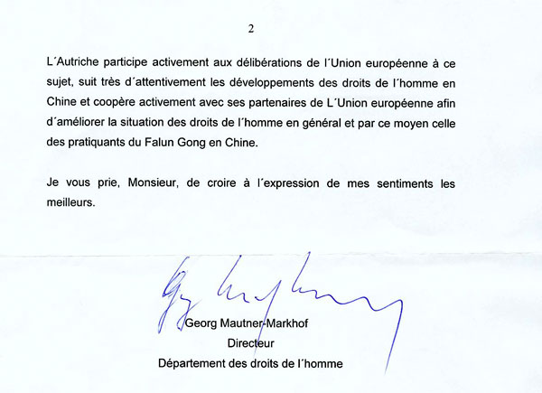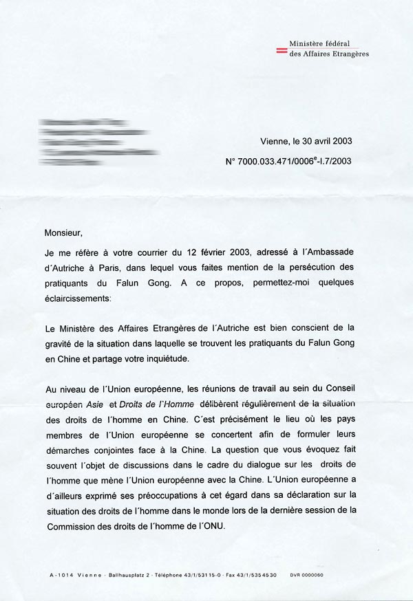 我读了您于2003年4月12日寄给奥地利驻巴黎大使馆的信,信中您提到法轮功学员被迫害的情况。就此,请允许我做一些说明。