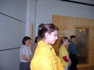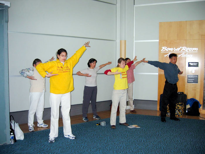 法会结束后,5月19日中午,我们抓紧一切时机在回程途中洪法讲真相。到达加拿大国际机场进入候机室以后,我们找到一块空地马上炼起功来,当时有两位纽约大法弟子也一同加入了进来。过路的旅客纷纷前来询问和获取大法真相资料及光盘。两位航空小姐向我们双手合十说:“我们很想学法轮功,真可惜今天没时间。”于是一位学员就送给这两位女士大法网址和真相光盘,她们非常感谢。还有一位旅客来到学员们面前,赞叹我们的炼功动作和谐优美,并主动索取光盘。附近一家咖啡馆里的客人们也被这祥和慈悲的能量场所吸引,他们面带微笑一直观看完了学员们的半小时的炼功,最后高兴地接受了我们赠送的真相光盘。
