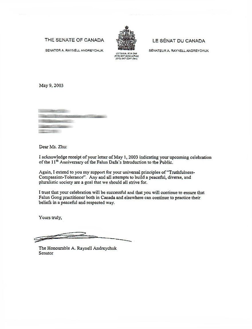我深信你们的欢庆活动会圆满成功,并且你们也会一如既往地确保加拿大和世界各地的法轮功学员能和平地,受人尊重地信奉自己的信仰。