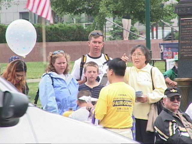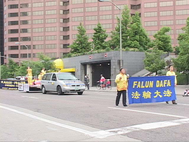 【明慧网2003年5月29日】五月二十四日,美国科罗拉多州大法弟子参加“国殇日”大游行。在游行中,法轮大法的花车格外引人注目。在花车上,中西族裔大法弟子表演了功法,并有大法弟子随行向观众发放了大法真相传单。
