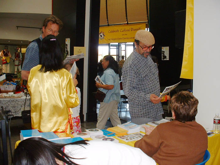 活动刚开始时,我们的摊位显得有点冷清,为了改变这种状态,学员想找一台电视和录像机播放大法录像,正这样一想,发现在旁边就有一套这样的设备在闲置着,学员与活动负责人联系,马上得到大力支持。缓慢优美的法轮大法音乐伴随着师父的教功演示吸引了与会者驻足观看,一位保安在电视前足足看了半个小时,最后拿了一叠资料和买了教功录像带才心满意足地走了。