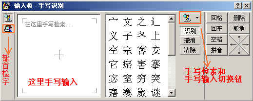 图中标出一个手写检索和手写输入切换钮,点击,切换到手写输入,这里可以连续输入,出现两个输入窗口,写完一个字,直接到另一个窗口写下一个字即可,只要每一画大方向没有错,字都认的很准,有需要的可以自己试用一下。