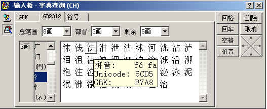 我们切换到GB2312那一项上,这就是普通的部首查字了,比如找一个“法”字,选择字的总笔画8画,部首笔画数3画,然后在左边选择部首“氵”,我找的“法”字就出现了。把鼠标放在上面会出现读音,很直观。