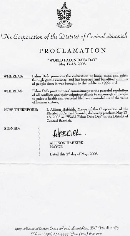 所以,我,Allison Habkirk, 中萨尼克区(the Corporation of the District of Central Saanich) 市长在此宣布5月17-18日为
