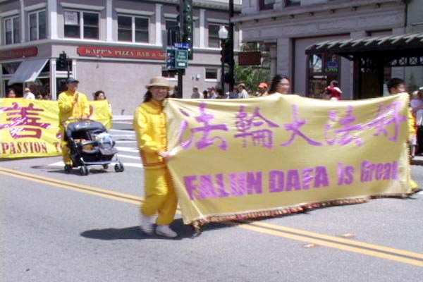 游行队伍中,学员们身着黄色炼功服,举着中英文“法轮大法好”和“真、善、忍”等横幅,非常引人注目。大法学员们列队在主席台前表演功法时,令人耳目一新的功法表演不仅赢得了观众们的热烈掌声,而且也吸引了当地电视台的镜头,主持人现场简要地介绍了法轮大法,并称赞大法学员的功法表演宁静祥和。