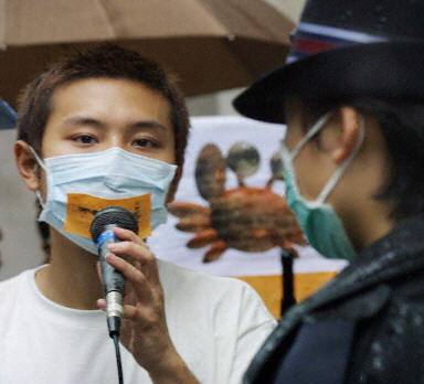 ![]() 5月3日一名学生在香港立法会外抗议23条立法,警察在旁边盯着。香港目前肺炎(SARS)流行,人们都戴着口罩。(法新社) |