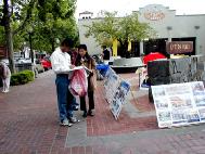 五月四日星期天,加州旧金山湾区法轮功学员在帕罗阿图(Palo Alto)市举行支持审判江××案和营救李祥春医生的图片展,向世人揭露江氏集团残酷迫害法轮功学员的罪行,支持对江××审判案,呼吁社会良知,营救李祥春医生。