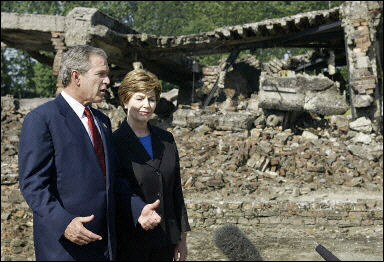 布什在第一夫人萝拉陪同下参观奥斯维兹死亡集中营,他在访客留言簿上写下:「愿各位的遭遇惕厉后世子孙戒慎恐惧,永不容奥斯维兹这类令人发指的邪恶重现世间。永志不忘!」