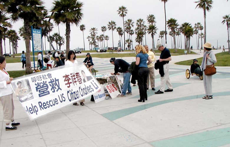 【明慧网2003年6月11日】6月8日星期天,几位洛杉矶法轮功学员来到热闹的维尼斯海滩(Venice Beach),向美国公众征集签名,呼吁营救美国公民李祥春医生。很多过路游客看到展板后,主动来到摊位上签名表示支持。