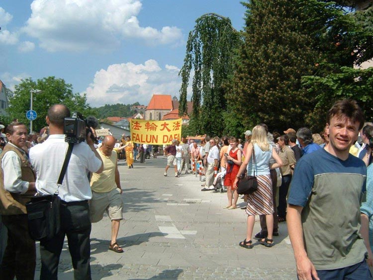 【明慧网2003年6月11日】在德国中部古城克龙那赫(KRONACH)庆祝该城千年寿诞的大游行中,当地学员组成的法轮功队列赢得了观众的频频喝彩,给当地居民和游客留下了深刻的印象。