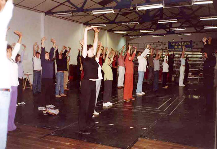 九讲班第一天早上,三位学员来到海港边炼功。正炼着,背后响起马达的“突突”声 ,随即静止下来。当学员们炼完功才发现一艘轮船停泊在岸边,船上的海员们都在凝神望着我们,看到我们炼完功,一位海员忙下舷梯向我们走来,一边不停地赞叹:“ 太美了!真是太美了!这是什么功?”我们告诉他是法轮功,并告诉他现在正在举办九讲班,今天晚上是第一讲。当晚这位海员与她的女友一同前来参加九讲班。