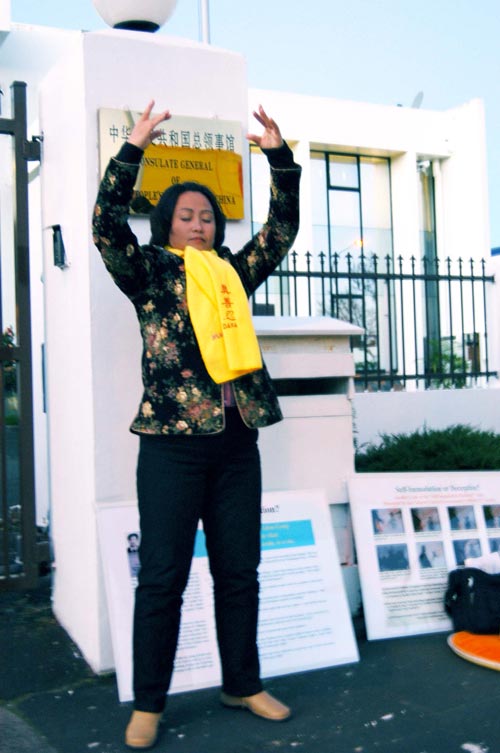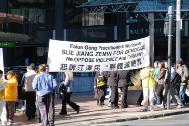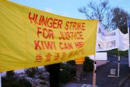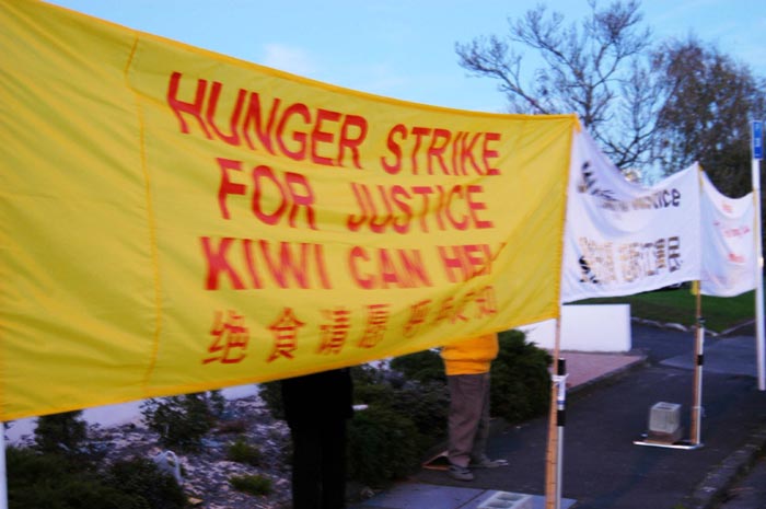 新西兰的法轮功学员还在中国驻奥克兰领事馆门前挂起“立即释放李祥春”,“支持起诉江××”等横幅,从今天起直到星期六,举行三天的“绝食请愿,呼唤良知”活动。