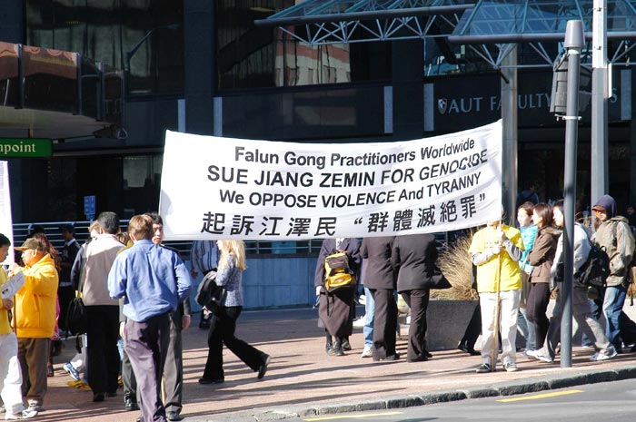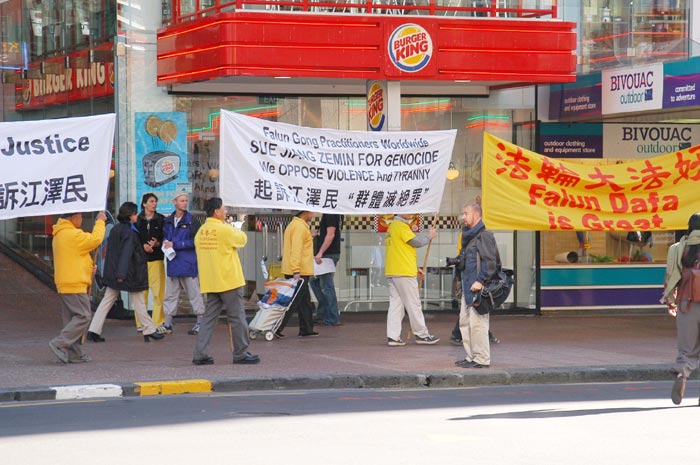 一位西人法轮功学员在游行前,首先向群众讲述了江××及610办公室镇压迫害法轮功已经四年了,而法轮功学员几年来一如既往地以平和、善良和理性的方式,向新西兰人民和海内外的中国人民讲清法轮功的真象。他表示,今天江××不但是迫害中国的法轮功学员,还将黑手伸向了海外,在新西兰,去年中国使馆干涉机场事务将法轮功海报取下就是一例。今天的集会,就是要揭露江××的“反人类罪行”,在这次中国的萨斯疫情中,他故意隐瞒事实,使得世界许多国家的人民受到无辜伤害。在迫害法轮功上他同样是故意隐瞒事实。他呼吁新西兰的善良人民支持法轮功学员起诉江××。