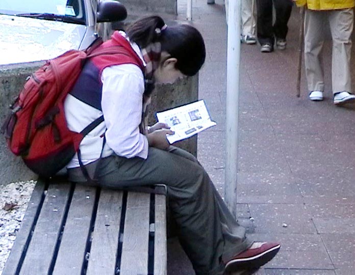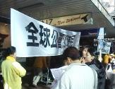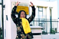| 参与绝食的学员在中领馆前炼功 | 一名华人留学生认真阅读大法真相传单 | |