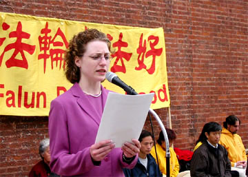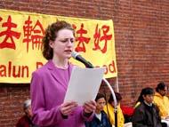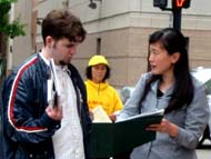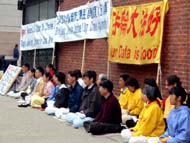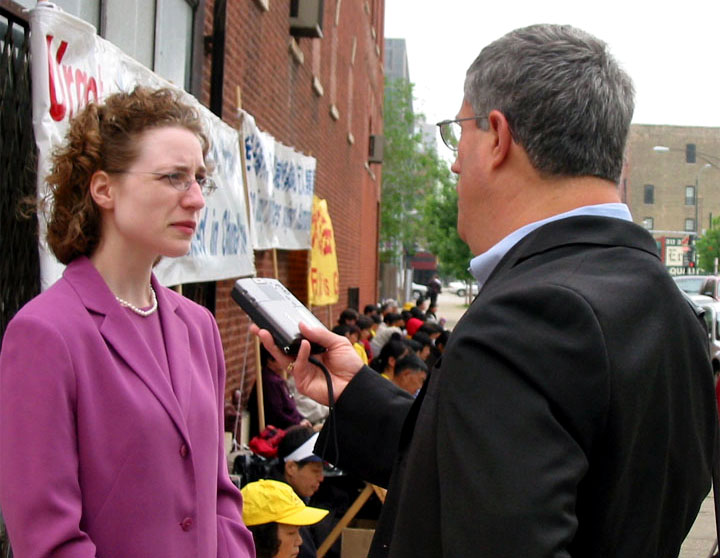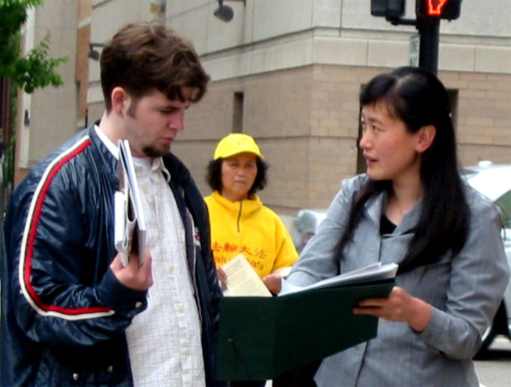 【明慧网2003年6月16日】六月十二日下午,芝加哥学员与部分来自世界各地的法轮大法学员一起,在芝加哥中领馆对面召开了新闻发布会。会上首先公布了在中国遭到非法监禁的美国公民李祥春的最新情况。在中国的监狱中,李祥春曾给美国大使写了一篇报告,材料的内容包括他在今年1月22日回中国一下飞机就被抓捕,然后受到的非法虐待、非法审讯和关押;以及他的三份长达69页的上诉书。由于狱警扣留了8页材料,李祥春于五月二十七日开始绝食抗议,要求将8页材料归还给美国大使。他因此而遭到灌食的折磨。最终,在他的坚持下,8页材料终于归还给了美国大使。