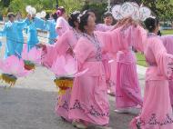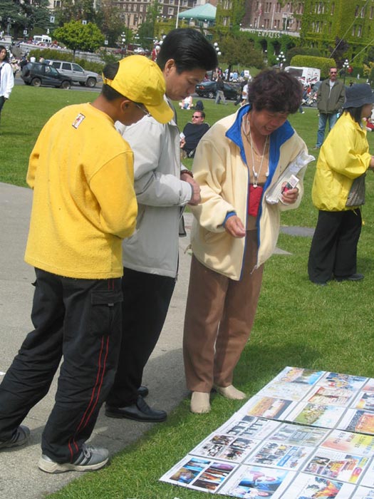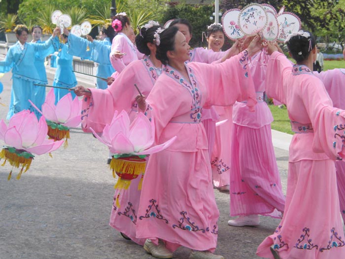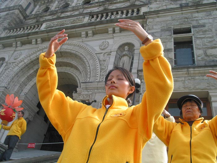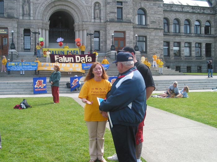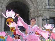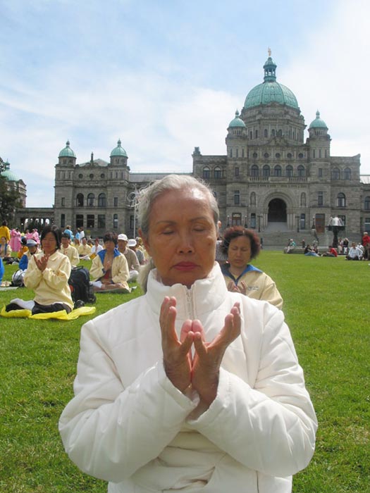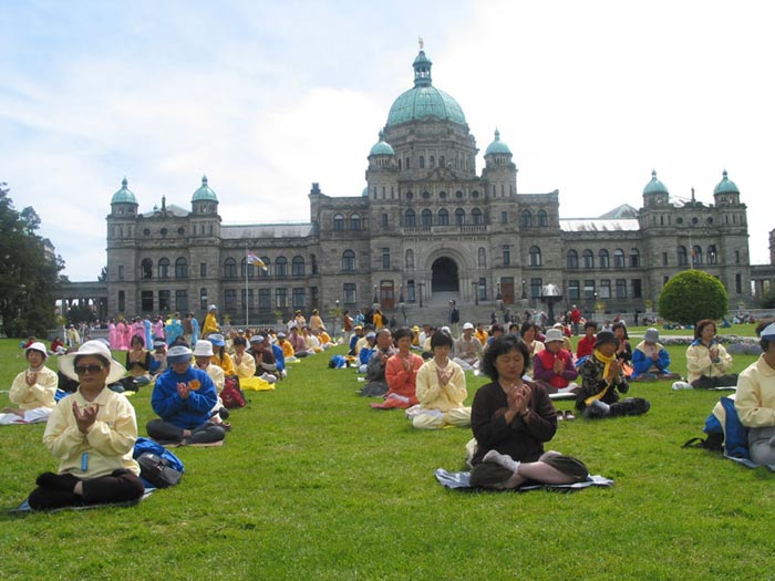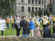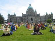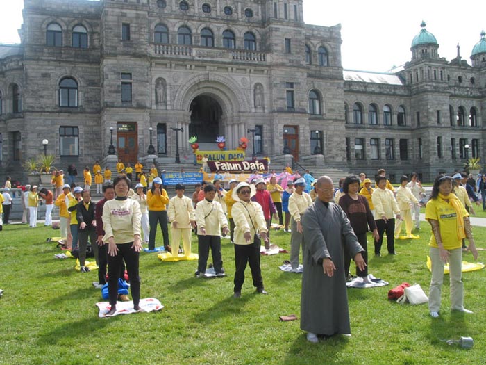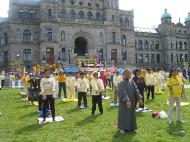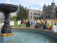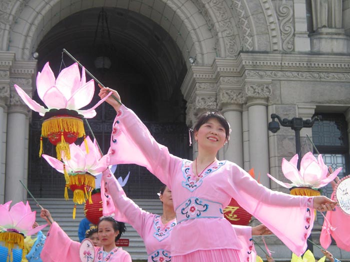 在星期天的法会之后,大部份学员离开了。星期一,即法会的第二天,是加拿大的节日维多利亚节。维多利亚市位于温哥华岛上,当日维多利亚市有盛大的游行,有一百多位学员参加了游行,并于游行后,在省议会大厦前面举行记者会及进行功法表演、舞蹈表演。在游人如织的维多利亚市,学员们平和的笑容、谐和的氛围及优美的舞姿吸引着人们的目光。身处其中,只有静静地拍照,捕捉那不断闪现的美丽、动人、祥和、平静,真切地感受着“大法之福”。时隔月余,依然好象在维多利亚市,在人潮中,在“美”的飞旋中。