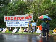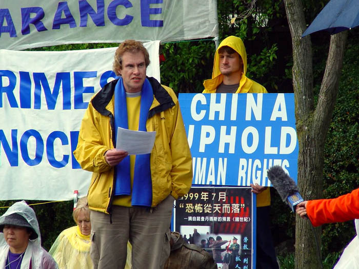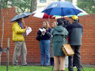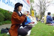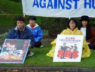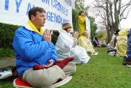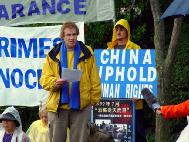 声明宣读前后,记者及摄影师还冒雨对几名法轮功学员进行了单独采访和拍摄。一名来自中国的法轮功学员说,她在中国的时候曾经被非法关押一年多。不仅法轮功学员受迫害,连家人、亲属、朋友甚至同事领导都有可能受牵连。这场迫害的规模在世界及中国历史上都空前的,完全符合“群体灭绝”的定义。这样的罪行在二十一世纪的今天必须得到制止。