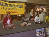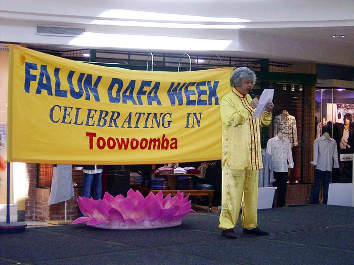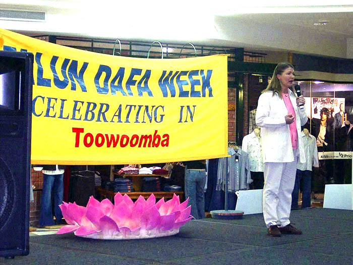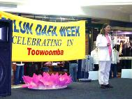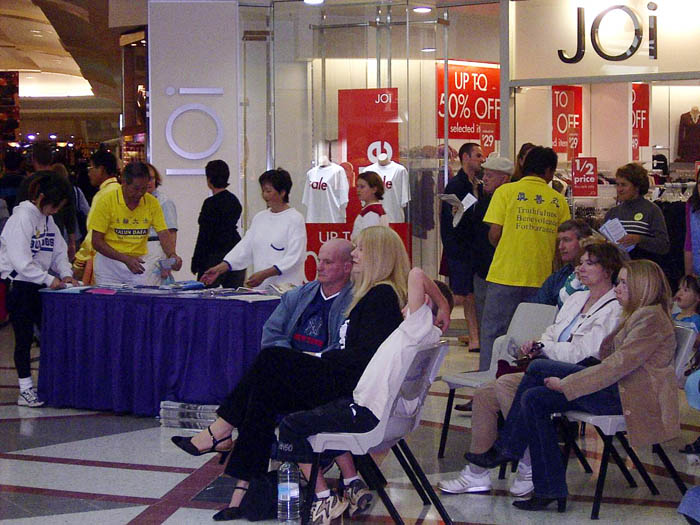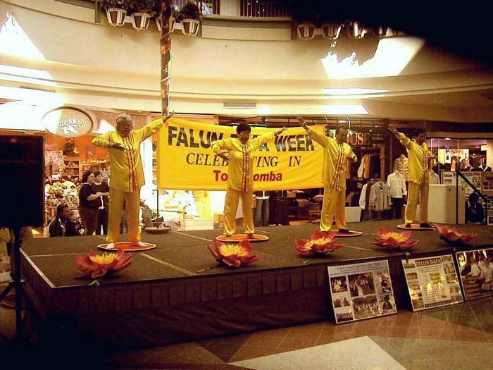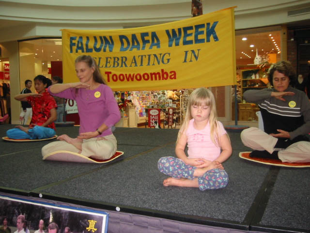接下来,学员们为公众穿插演示了法轮功五套功法,并表演了优美的中国传统舞蹈,受到观众们的热烈欢迎。人们都被优美祥和的法轮功吸引住了,一个小女孩禁不住爬到台上和学员一起认真地打起坐来。