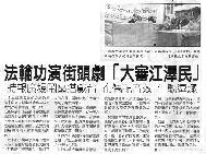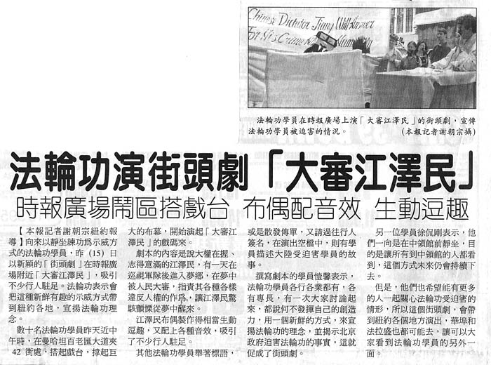 数十名法轮功学员昨天近中午时,在曼哈坦百老汇大道夹42街处,搭起戏台,撑起巨大的布幕,开始演起「大审江泽民」的戏码来。
