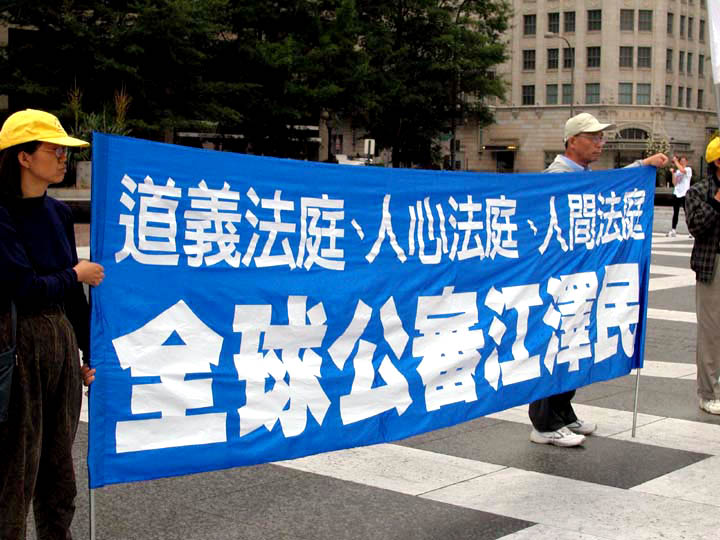2002年10月18日,法轮功成员在10月18日以“群体灭绝罪”将江××告上芝加哥法院,指控它“导致了数以千计法轮功修炼者被谋杀,失踪,广泛遭受酷刑和群体灭绝,以及残酷的,丧失人性的和毁灭性的虐待”。一直对外宣称目前是“中国人权状况最好时期”和“中国正在建设一个法制社会”的江××却没有勇气在法庭上当面陈述那些他亲自派发给各国元首的诋毁法轮功的小册子中的借口。中国外交部发言人一开始极力否认此案的存在,而同时江泽民却动用外交手段,表示“愿意付一切代价阻止此案成立”。在中方强大的外交压力下,美国司法部中的一些人曾向法庭提出终止该诉讼案的提议。另一方面,美国38位国会议员联署了“法庭之友”陈述书,支持芝加哥联邦地区法院继续审理对江泽民的“群体灭绝罪”起诉。联署人之一,德克萨斯州国会议员Chris Bell先生在接受采访时表示他反对任何幕后交易,他说:“法院是一个你可以把一切事实都摆上桌面的地方,每个人都可以自由陈述,其结果就是明辨是非。”6月12日,芝加哥地区法院接受了国会的陈述书,并将在近期就是否继续进行此案做出决定。
