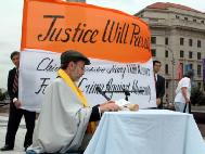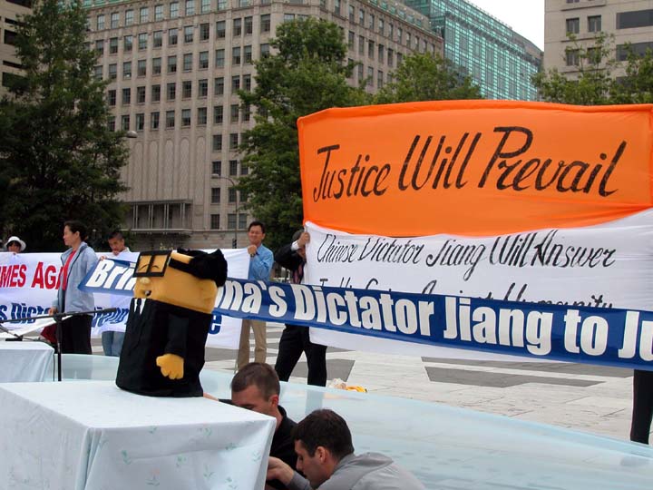 一些法轮功学员远道从纽约州赶来参加这次集会,并与华盛顿DC的当地学员表演了在“人类尊严与道德法庭”公审江××的布偶戏。这场镇压的受害者,马里兰州的赵兰香女士质问布偶江为何将她的妹妹,准备起诉江××的原告赵美玉女士投入劳改营;胡宗义博士质问布偶江为何仅仅因为他的弟弟修炼法轮功就将他投入劳改营;美国公民李祥春的未婚妻符泳清小姐质问布偶江为何将无辜的李祥春判刑三年,对他进行肉体和精神迫害;四岁的小弟子王真质问布偶江为何迫害她的外婆。最后,道德法庭的法官宣判江××有罪,并将受到永无休止的惩罚。